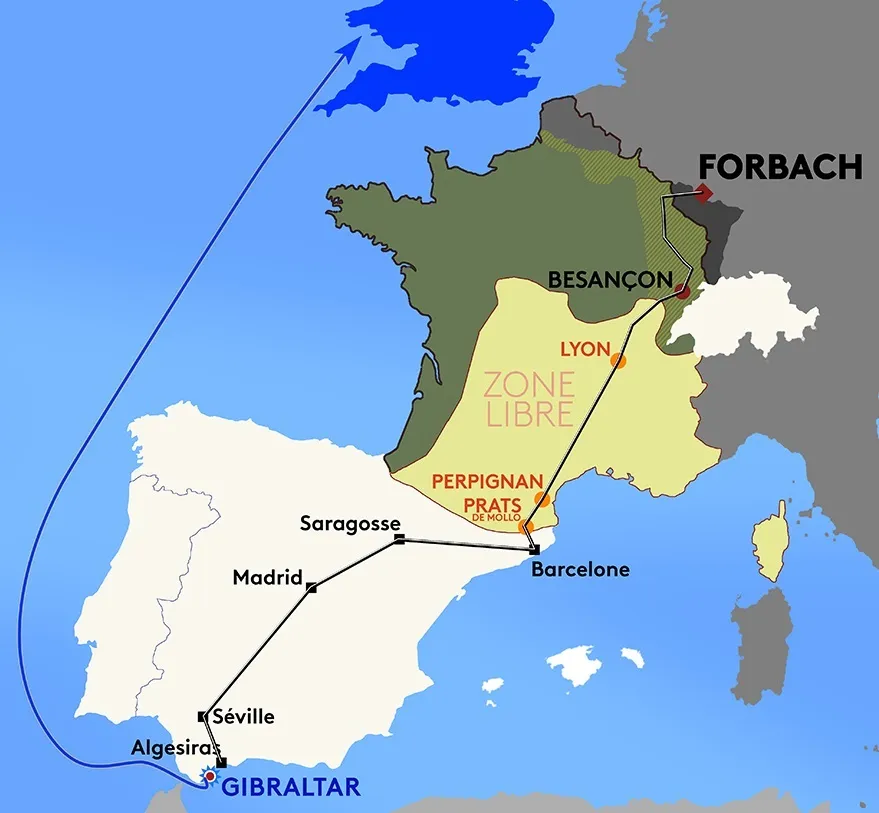 Les consulats anglais et américains l’abritent. Sa maîtrise de l’allemand l’aide à se faire passer pour un citoyen du Reich. Il finit par rejoindre Algesiras, et Gibraltar. Un territoire britannique où il peut, après plusieurs péripéties, trouver un navire lui permettant d’atteindre l’Angleterre.