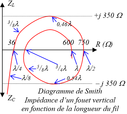 Les valeurs de l’impédance du doublet demi-onde et du quart d’onde ont été vues plus haut. Dans tous les cas, l’impédance de l’élément rayonnant dépend de sa forme et de son environnement. L’impédance d’un fouet vertical (avec radiants à 90° ou plan de masse) peut être estimée grâce au diagramme de Smith représenté ci-contre. Un brin rayonnant d’une longueur d’une demi-onde aura une impédance de l’ordre de 750 Ω purs (et 600 Ω pour une onde entière).