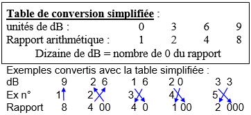 Table de conversion : le nombre des dizaines de dB correspond à l’exposant de la puissance de 10 du rapport de puissance (c’est-à-dire au nombre de 0 du rapport arithmétique). Les principales unités de dB sont indiquées en gras dans le tableau ci-dessous (0, 3, 6 et 9 dB correspond à un rapport arithmétique arrondi de 1, 2, 4 et 8).