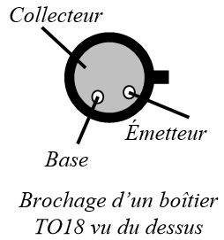 Le transistor est monté dans un boîtier et, selon le boîtier, le brochage diffère (ci-dessous: boîtier TO18 avec l’ergot repérant l’émetteur). Le collecteur est connecté au boîtier s’il est métallique.