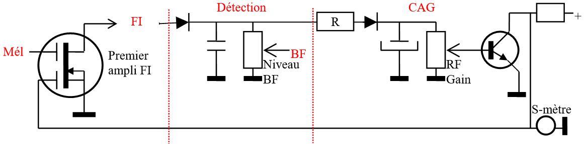 Le contrôle automatique de gain (CAG) est un dispositif qui permet d’obtenir le même niveau B.F. quelle que soit la force du signal H.F. à l’entrée du récepteur. Plus précisément, le CAG agit sur le gain des étages RF d’entrée et/ou sur celui des étages FI afin qu’ils ne soient pas saturés en présence d’un signal fort et que le signal à leur sortie soit exploitable (non écrêté). In fine, c’est bien le niveau BF qui est impacté par ce circuit. La tension à l’entrée de l’étage CAG est prélevée sur la détection à travers la résistance R. Le niveau de CAG est réglé par le potentiomètre RF Gain. La tension de sortie ajuste le gain d’un étage FI à transistor FET double porte (ou le gain d’un autre étage RF). C’est cette tension qu’indique le S-mètre du récepteur.