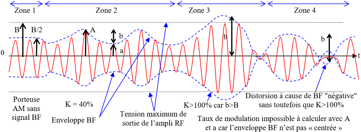 Si l’enveloppe BF passe au dessus de « B » (zone 3) ou si l’enveloppe BF passe en dessous de 0 (zone 4), il y a surmodulation et distorsion du signal BF puisqu’une partie de celui-ci n’est pas émis. La modulation est optimisée lorsque la valeur « b » est la plus grande possible, sans toutefois que l’enveloppe BF dépasse les deux limites énoncées ci-dessus (0 et B) car, au-delà, les distorsions sont sévères.