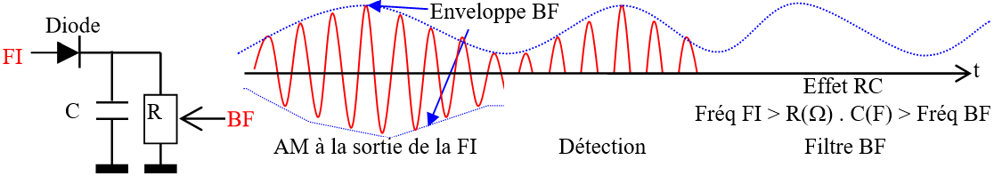 La détection (ou détecteur d’enveloppe) est constituée d’une diode suivie d’un circuit RC passe-bas pour filtrer la H.F. Le niveau B.F. appliqué à l’amplificateur AF est ajusté sur le point variable du potentiomètre R. Le semi-conducteur utilisé pour la diode pourra être du Germanium car sa tension de seuil (0,3 volt) est plus faible que le Silicium : l’enveloppe BF sera ainsi mieux restituée dans les creux. Les diodes de détection se présentent souvent sous la forme de petits tubes en verre avec une pointe métallique à l’intérieur.