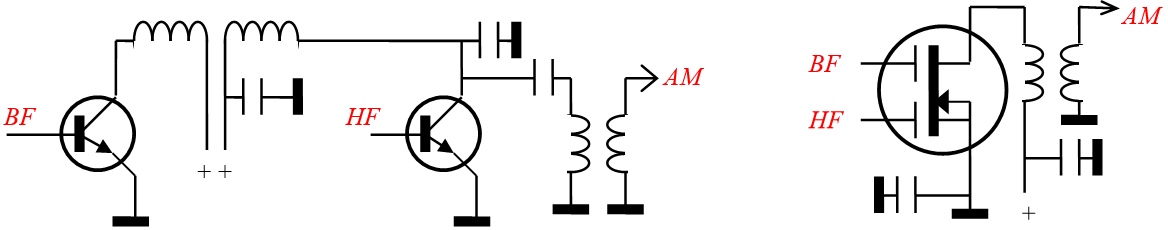 Une onde porteuse en AM peut être modulée de différentes façons : en agissant sur l’alimentation de l’amplificateur final (schéma à gauche) ou en mélangeant HF et BF grâce à un MOS-FET (schéma à droite).