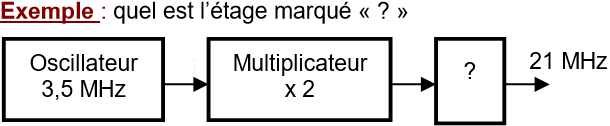 L’oscillateur génère du 3,5 MHz et la fréquence de sortie est 21 MHz. La fréquence de l’oscillateur est donc multipliée par 6 (21 / 3,5 = 6). Un multiplicateur par 2 est