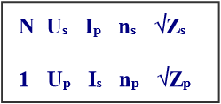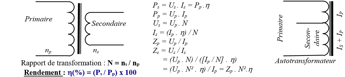 Rapport de transformation N = ns / np (si N>1, le transformateur est élévateur, sinon il est abaisseur)