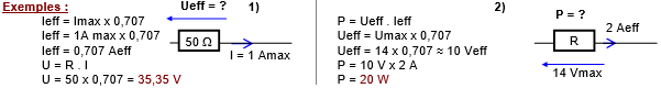 Attention : seules les valeurs efficaces (Ueff et Ieff) doivent être utilisées dans les calculs en courants alternatifs sinusoïdaux pour appliquer les lois d’Ohm et de Joule. Il faut donc transformer toutes les valeurs en valeurs efficaces avant d’effectuer d’autres calculs. Les valeurs efficaces ne portent aucun signe (+ ou –) et calculer la valeur efficace de deux signaux superposés est difficile sans utiliser trop de mathématiques.