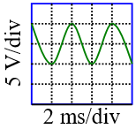Tension efficace : le signal occupe 2 divisions (en hauteur). L’indication 5V/div permet de définir la tension crête à crête du signal, soit 10 Vcàc, soit 5 Vmax, soit 3,53 Veff (= 5 Vmax x 0,707) en supposant que le signal n’ait pas de composantes continues.
