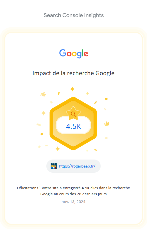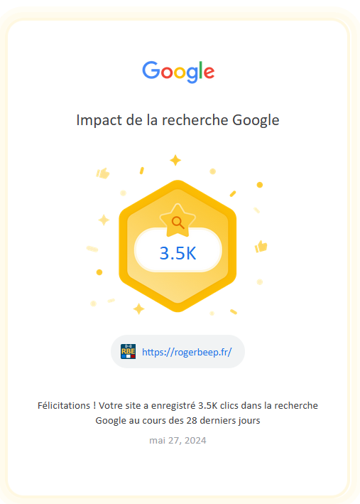 3500, puis 4500 clics le mois suivant et ça continue de progresser ! Par de véritables utilisateurs (pas des robots) ! Pour un petit site ultra spécialisé comme le notre, on est pas Google 🙂 Je pense que c’est une belle performance et Google le pense aussi si j’en crois le mail reçu (images ci-dessus) ! Le site intéresse les gens concernés par la radio.